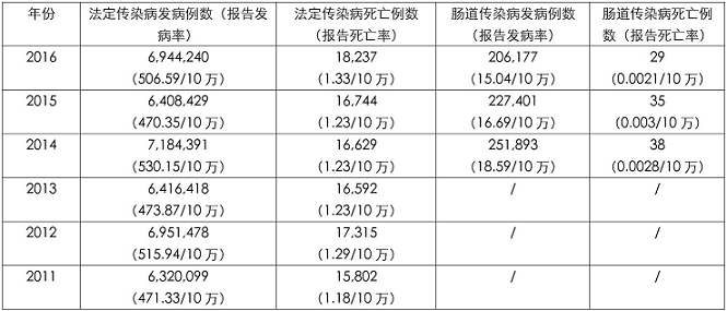 目前除脊髓灰質(zhì)炎和腸道病毒 71 型外,尚無(wú)疫苗 可供預防,是當前嚴重影響人類(lèi)健康的重要病原之一。據國家 CDC 法定傳染病報告統計(大陸地區,下同)網(wǎng)站公布的數據(見(jiàn)表 1),按甲乙類(lèi)傳染病傳播途徑,自 2011 年以來(lái)腸道傳染病發(fā)病例數連續六年居于榜首。
