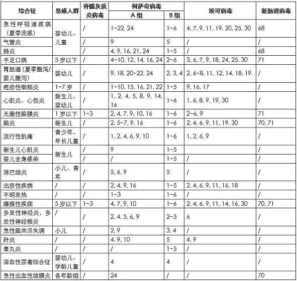腸道病毒感染在兒童時(shí)期尤為多見(jiàn)。其中柯薩奇 病毒、??刹《咀R別的受體在組織和細胞中分布廣泛,包括中樞神經(jīng)系統、心、肺、胰、粘膜、皮膚和其它系統,因而引起的疾病譜復雜,如呼吸道感染、散發(fā) / 爆發(fā)性腦膜炎、腦炎、心肌炎、心包炎、手足口病、皰疹性咽峽炎、嬰兒腹瀉、流行性胸痛、發(fā)熱、出疹性疾病、 散發(fā)性脊髓灰質(zhì)炎麻痹癥以及流行性急性眼結膜炎等(詳見(jiàn)表 2)。